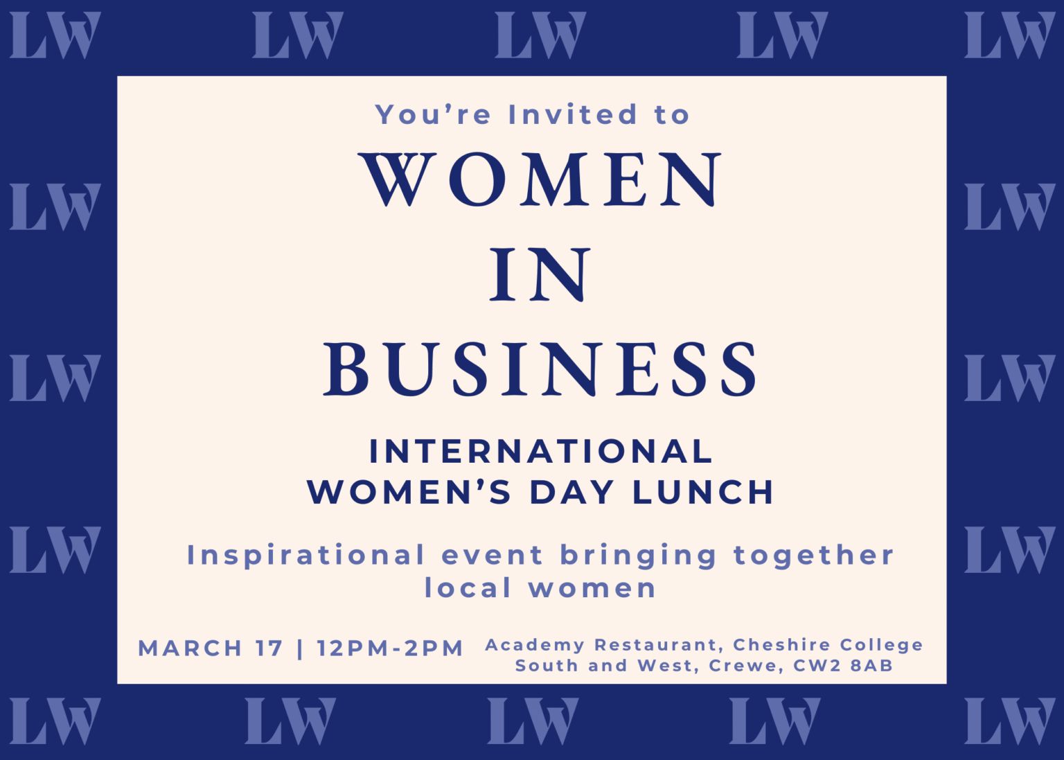 - Women in Business Lunch at Cheshire College Crewe on 17th March, 12pm-2pm. Only £20 with a great line up on speakers - celebrating International Womens Day.